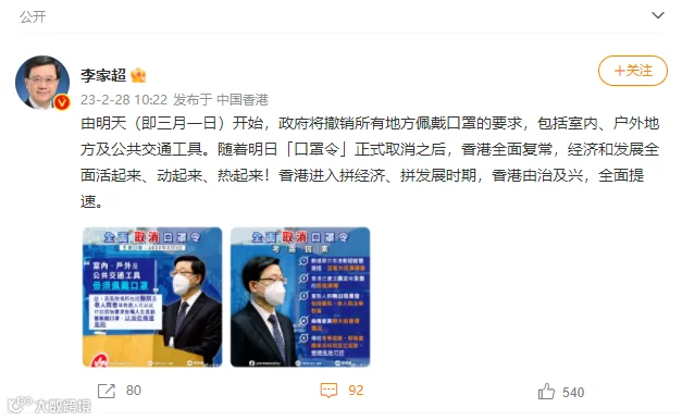 超发了一条微博称,随着明日口罩令正式取消之后,