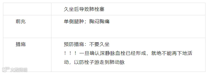 长途旅行,聚会打牌或熬夜游戏之后,久坐产生的下肢深静脉血栓一旦阻塞肺动脉,可在1~2小时内迅速致死。肺栓塞的征兆与应对措施如表所示。