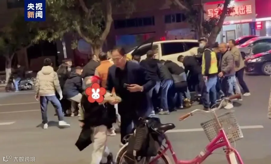 “快来救人!”司机一边大喊,一边在车尾厢拿出千斤顶,试图抬高车身救人。叫喊声吸引了周围人的注意,一时间,路上的行人、路过的司机、路面商铺的店家、在饭馆就餐的食客、骑车着急送外卖的小哥,甚至还有骑自行车路过的老人家,纷纷从四面八方闻声赶来施以援手!距离事发不到1分钟,便集结了20余名群众。