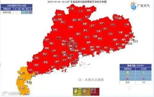 另外,截至2日上午10:12时全省森林火险预警信号继续生效,除雷州半岛维持森林火险橙色预警信号外,其余市县均发布了森林火险红色预警信号。截至3日上午9:45,广东103个森林火险预警信号生效中。