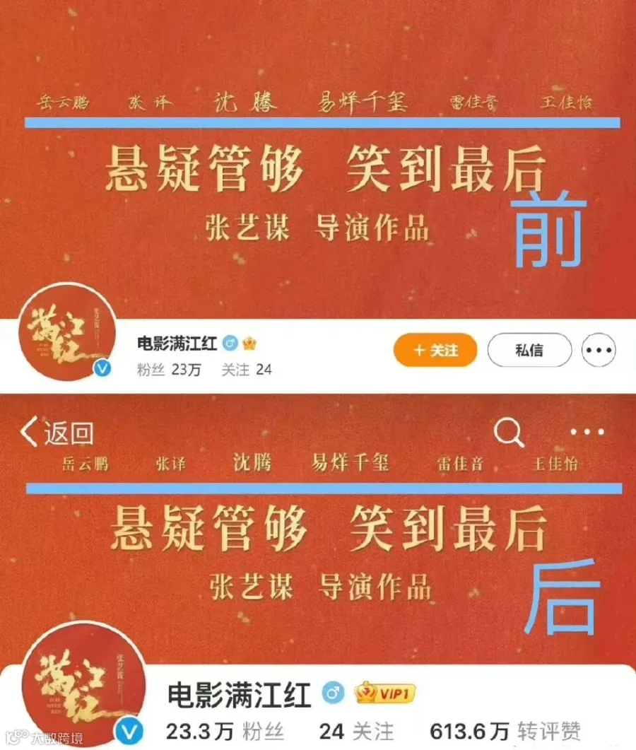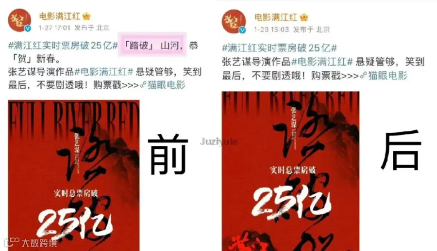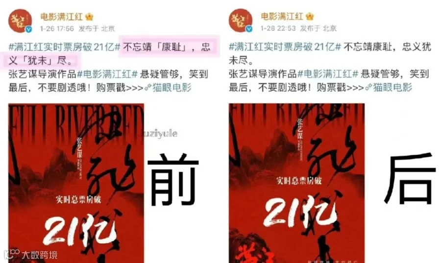 “文盲”现象也在另一部春节档电影的宣传中出现。《满江红》实现票房破21亿元时,该片官方微博发布了一则消息:“不忘靖「康耻」,忠义犹未尽。“靖康”是连在一起的年号,片方竟然给分开了。事情发酵之后,片方修改了。