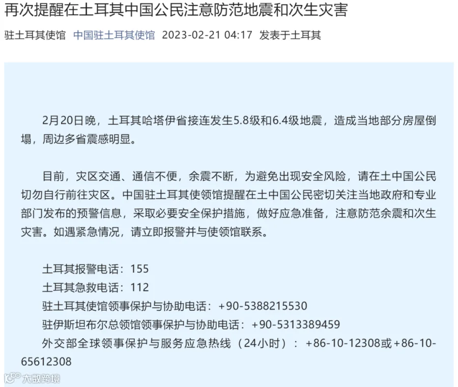 来源:中国新闻网综合央视新闻客户端、新华社、中国驻土耳其使馆