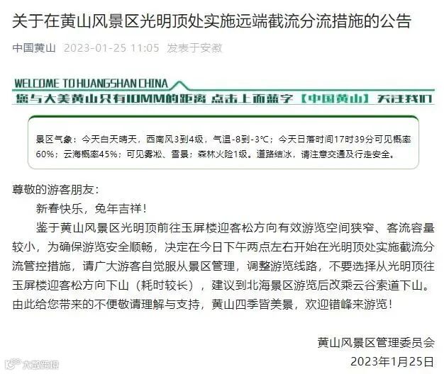 随后景区连夜商讨出限流方案,25日起,景区将开门时间从早上7点提前到6点40分,下午4点之后景区游客只出不进。