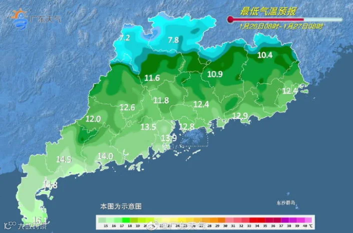 29日(初八),全省晴间多云。早晨最低气温:粤北市县1℃~3℃(高海拔山区零下2℃左右),南部沿海市县7℃~10℃,其余大部市县4℃~6℃。