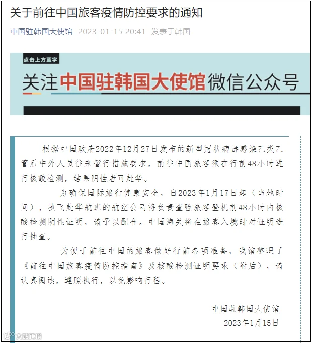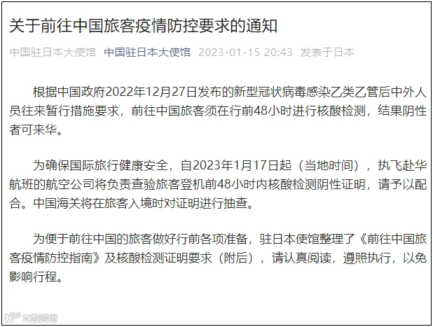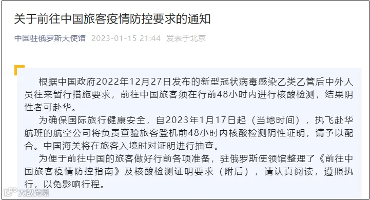 另据梳理,1月15日,中国驻日本大使馆、中国驻韩国大使馆、中国驻俄罗斯大使馆、中国驻加拿大大使馆、中国驻巴西大使馆、中国驻新加坡大使馆等均发布关于前往中国旅客疫情防控要求的通知。其中均提到:前往中国旅客须在行前48小时进行核酸检测,结果阴性者可来华。
