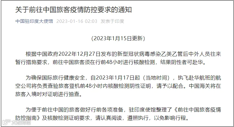 1月16日,中国驻印度大使馆发布相关通知,其中提到:前往中国旅客须在行前48小时进行核酸检测,结果阴性者可赴华。