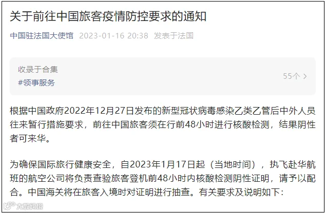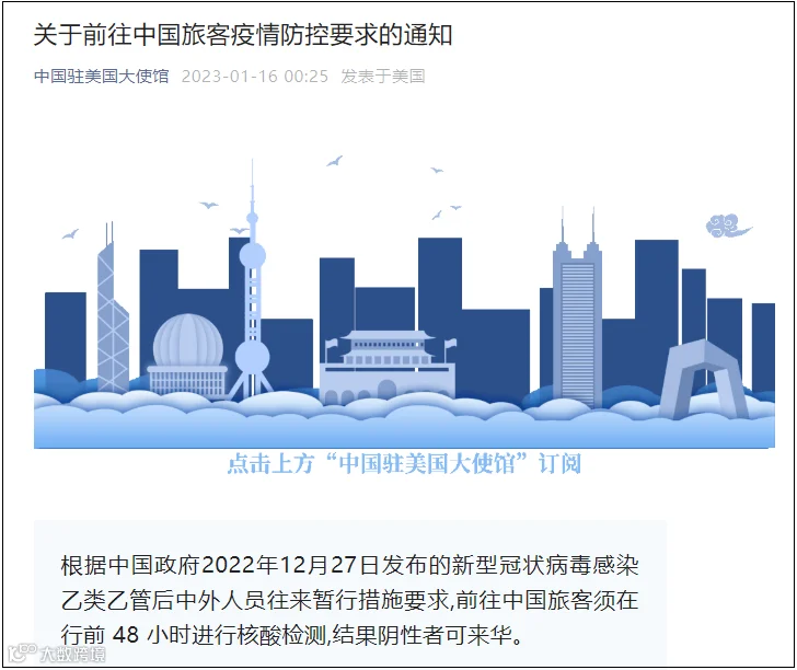 昨天(1月16日),中国驻美国大使馆、中国驻法国大使馆、中国驻印度大使馆发布通知:登机前48小时内核酸检测阴性者方可来华。