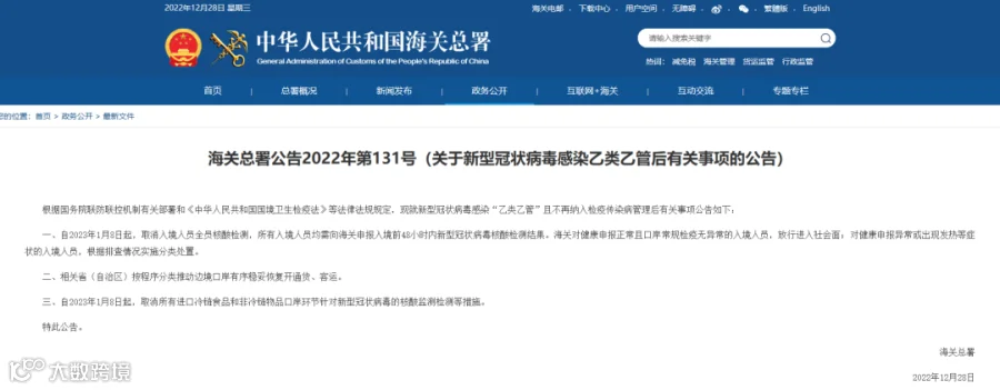 12月28日,海关总署网站发布《海关总署公告2022年第131号(关于新型冠状病毒感染乙类乙管后有关事项的公告)》,全文如下: