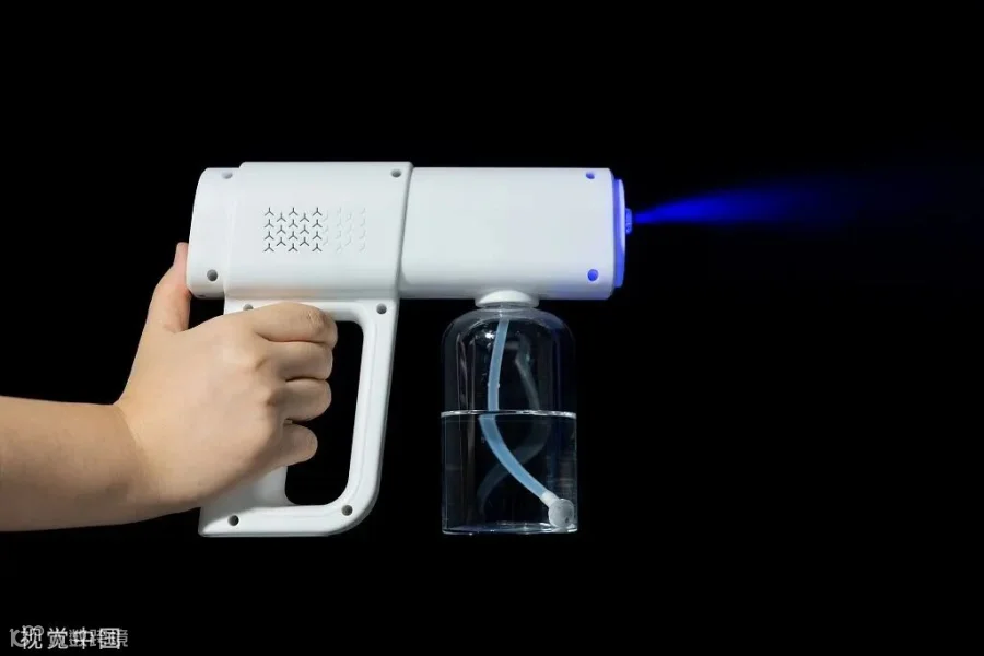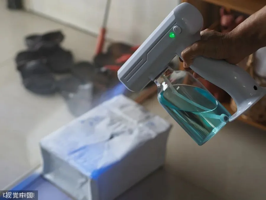 酒精、84消毒液这些常见的消毒产品,如何发挥出更大的功效?在一些售卖消毒喷雾枪的商家口中,将这些液体放入喷雾枪的水箱后,通过高压空气泵和雾化喷头喷射,便能实现纳米级雾化输出,阻断气溶胶传播路径。不仅如此,多数喷雾枪还增添了蓝光功能,可以辅助“杀菌消毒”。