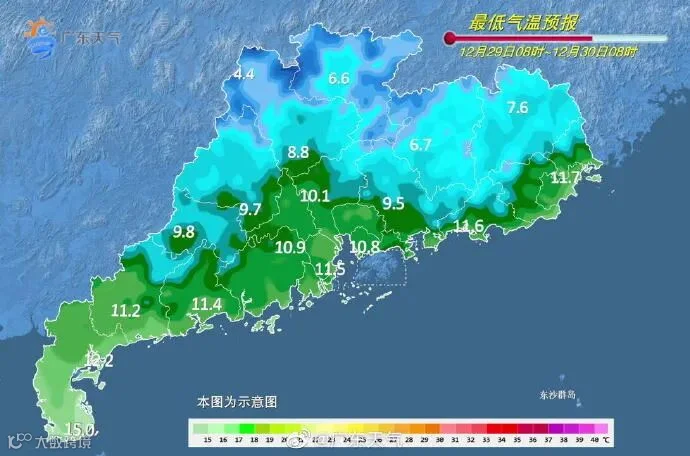 30日最低气温:粤北市县2℃~5℃,其中高海拔山区零下2℃~1℃,有霜(冰)冻,南部沿海市县10℃~13℃,其余市县6℃~9℃。