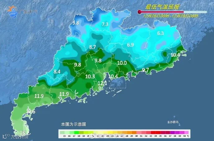最低气温:粤北偏北市县3℃~6℃,其中高海拔山区零下1℃~2℃,局地有雨夹雪和道路结冰,粤西和珠江口附近市县11℃~14℃,其余市县7℃~10℃。