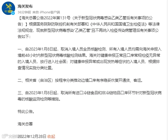 12月28日,海关总署办公厅官方微博“海关发布”发布了《关于新型冠状病毒感染乙类乙管后有关事项的公告》,其中提到,自2023年1月8日起,取消入境人员全员核酸检测,所有入境人员均需向海关申报入境前48小时内新型冠状病毒核酸检测结果。