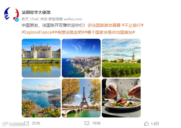 昨日,法国驻华大使馆官方微博更新动态:“中国朋友,法国张开双臂欢迎你们!”