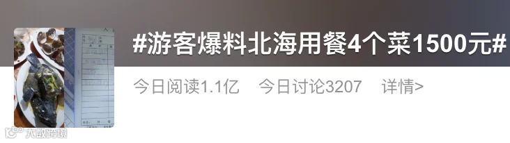 据媒体报道,1月24日晚,有游客在北海旅游时,被出租车司机带去位于银海区的侨民海港海鲜加工城就餐。其间,游客一行人点了油螺辣炒、龙顶清蒸、马蹄和贵妃辣炒4个菜,结账时共支付1500元,回到民宿后才得知菜价离谱。