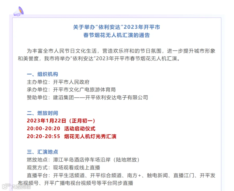 “开平发布”20日发布“关于举办‘依利安达’2023年开平市春节烟花无人机汇演的通告”。通告中称,1月22日(正月初一)晚,广东开平市将在潭江半岛酒店停车场沿岸举办2023年春节烟花无人机汇演。