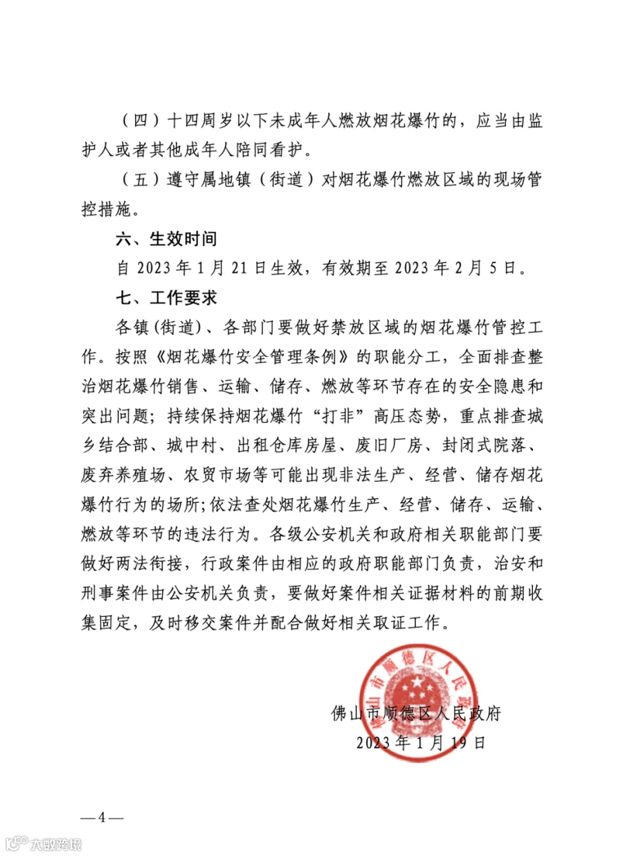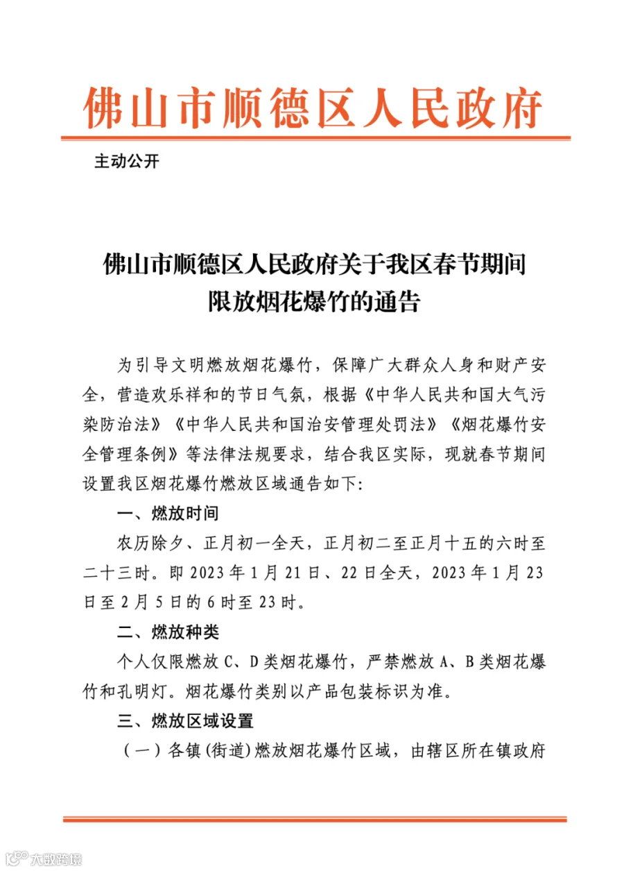 1月20日,广东佛山市顺德区人民政府发布了“关于我区春节期间限放烟花爆竹的通告”。通告中称,燃放时间为农历除夕、正月初一全天,正月初二至正月十五的六时至二十三时,即2023年1月21日、22日全天,2023年1月23日至2月5日的6时至23时。各镇(街道)燃放烟花爆竹区域,由辖区所在镇政府(街道办事处)划定并对外公布。