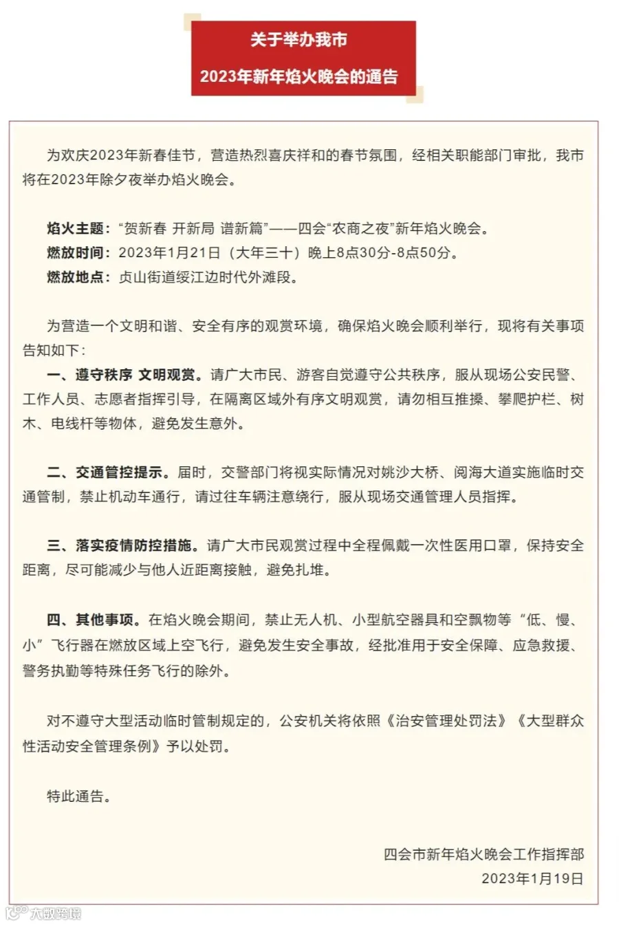 1月19日,肇庆四会市发布了“关于举办我市2023年新年焰火晚会的通告”。通告宣布,1月21日(大年三十)20:30,四会市将在贞山街道绥江边时代外滩段举办新年焰火晚会。
