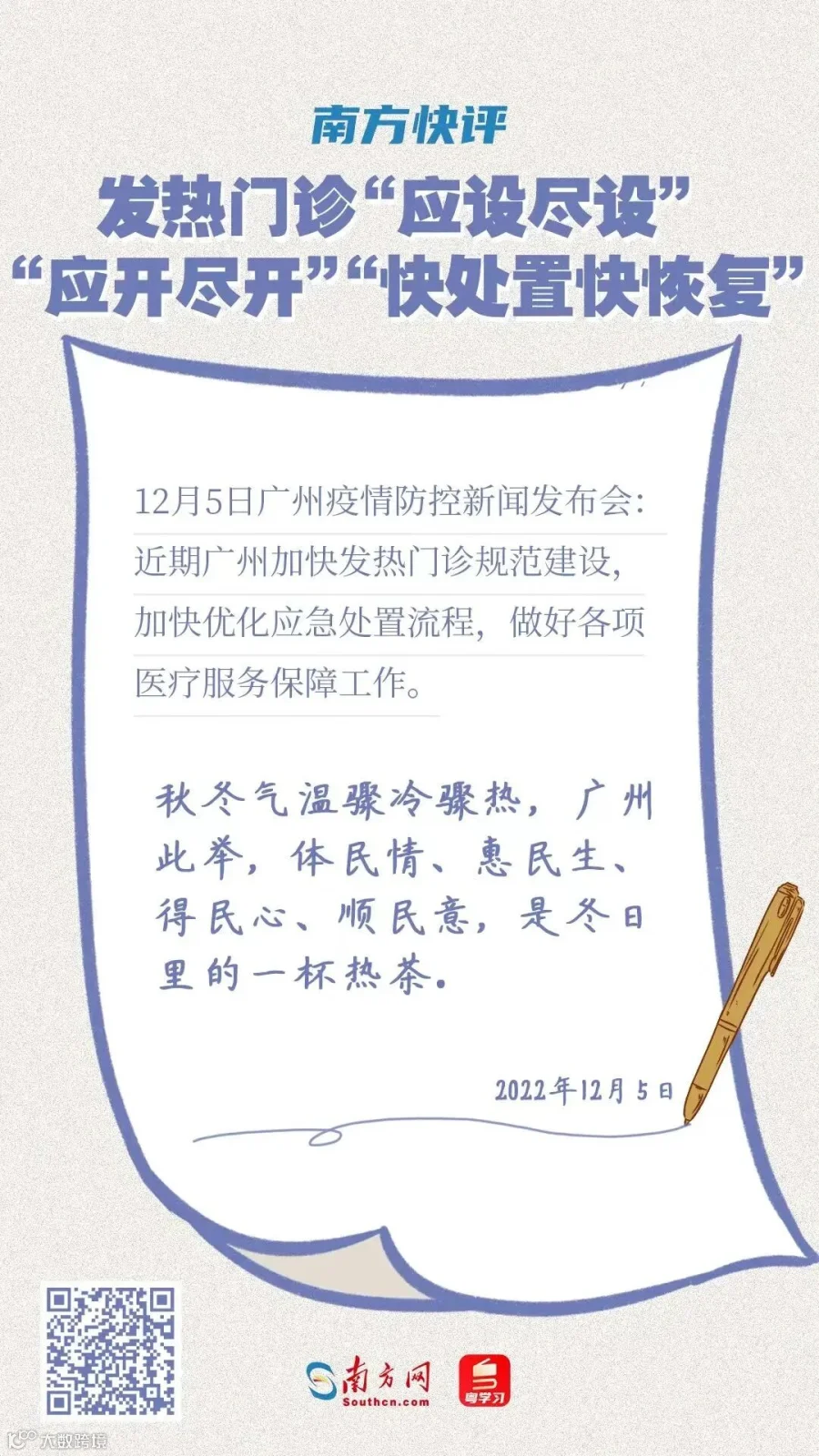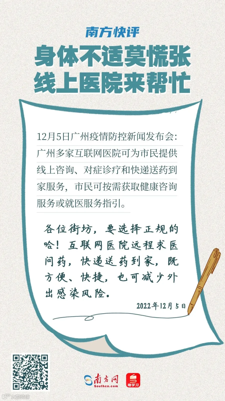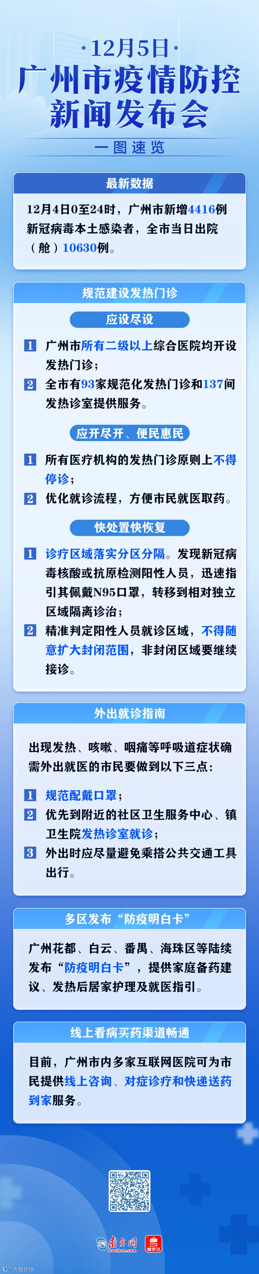近日,广州市花都、白云、番禺、海珠等区陆续发布了“防疫明白卡”,提供了家庭备药建议、发热后居家护理及就医指引。目前,市内多家互联网医院可为市民提供线上咨询、对症诊疗和快递送药到家服务,市民可按需获取健康咨询服务或就医服务指引。请市民朋友继续密切关注防控部门发布的权威信息。