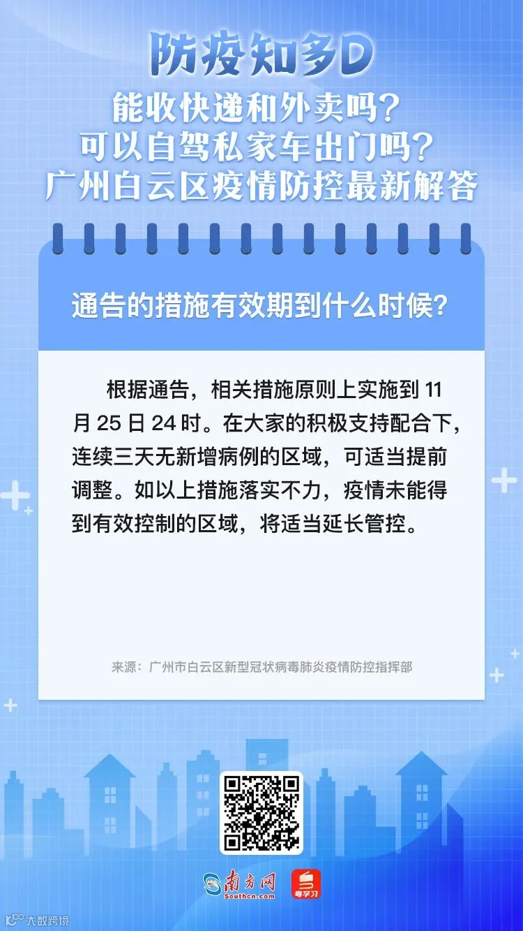 11月21日,广州市白云区发布了关于强化社会面疫情防控措施的通告。即日起,白云区严格控制人员流动,市民除接受核酸检测和紧急就医等外,原则上非必要不外出;实行临时交通管控,地铁、公交全时段暂停服务;除承担防疫任务的医务工作者、保供人员、社区工作人员、城市运行保障工作人员、志愿者、机关事业单位干部职工,其他人员原则上居家办公,或就地转为社区志愿者;中小学阶段学校、幼儿园暂停返校及线下教学。