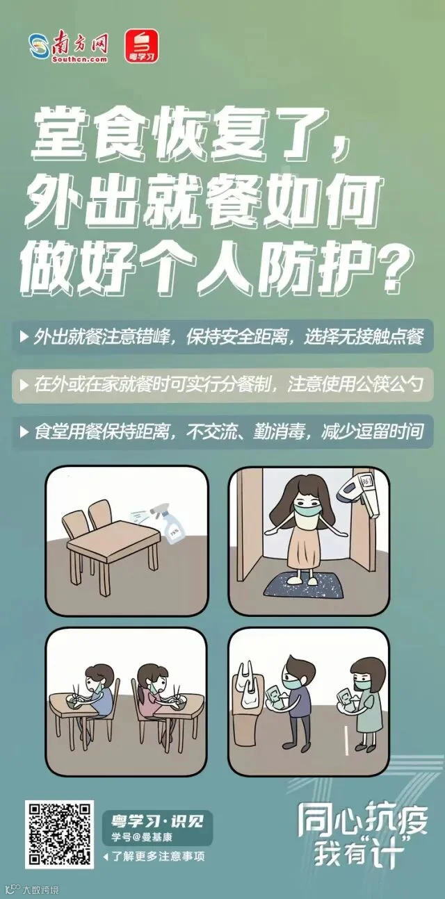 南方网、粤学习客户端同心抗疫我有“计”——防疫知识分享平台自11月11日上线以来,获得了广大网友的关注,不少热情网友在平台上与我们共享了实用的防疫知识。近日,广州多区恢复正常生产生活秩序,网友整理了外出堂食应如何做好个人防护的小知识。