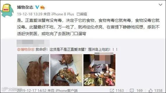 “正直爱洁蟹有没有毒,决定于它的食物,食物有毒它就有毒,食物没毒它就没毒。此蟹最好不吃,万一吃了,感到不适赶快就医,或吃完了去医院门口遛弯。”