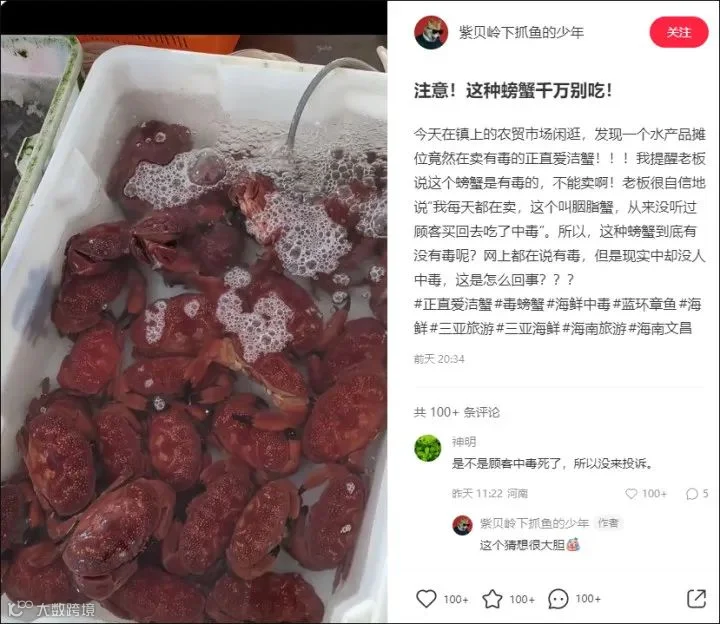 “今天在镇上的市场闲逛,发现一个水产品摊位竟然在卖有毒的正直爱洁蟹!”因为最近网传“蓝环章鱼”混入火锅菜品的事件,在某社交平台上,一位海南文昌网友在1月18日发布的一条视频,迅速引来关注。