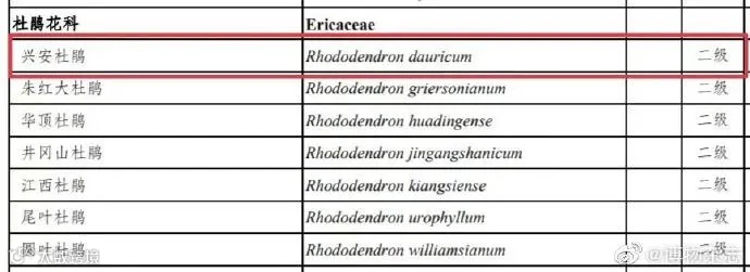 在这种背景下,2021年9月,国家林草局和农业农村部新颁布的《国家重点保护野生植物名录》中,已将兴安杜鹃列为国家二级重点保护植物。