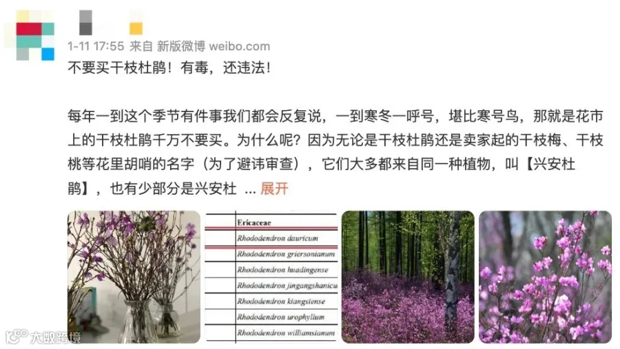 为什么呢?因为无论是干枝杜鹃还是卖家起的干枝梅、干枝桃等花里胡哨的名字,它们大多都来自同一种植物,叫【兴安杜鹃】,也有少部分是兴安杜鹃的亲戚迎红杜鹃。它们目前尚未实现大规模的商业化栽培,所以市场上卖的基本都是野外直接砍回来的,做的是无本万利的生意。
