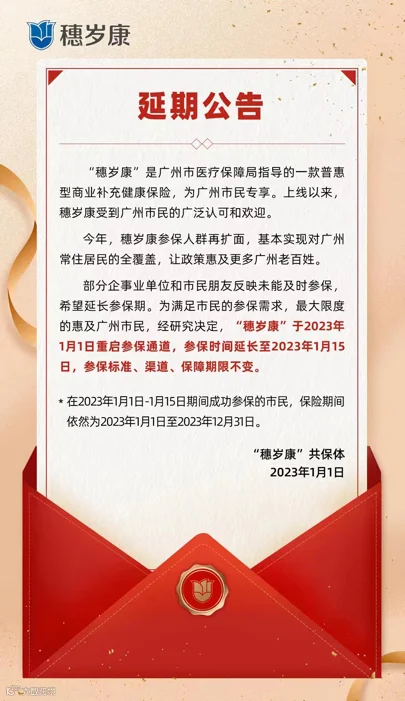 1月1日,“穗岁康”共保体发布《延期公告》称,将2023年度“穗岁康”的参保时间延长至2023年1月15日。在2023年1月1日-1月15日期间成功参保的市民,保险期间依然为2023年1月1日至2023年12月31日。
