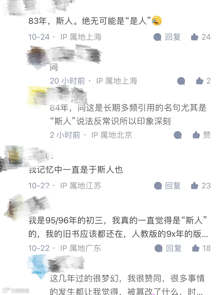 网友们更是不淡定了,绝大多数的“70后”、“80后”都表示,自己所学所背的课文就是“斯人”;也有少数“90后”、“00后”表示课文就是“是人”……如果是“是人”,那么为什么会有这么多记忆偏差;如果是“斯人”,为什么又在课本上找不到?要知道二三十年前可没有什么语文课外辅导教材,大家都是跟课本学。为此,有不少网友把自己的疑问和考证都发在网上,更是引起了各个年代集体记忆的热议。