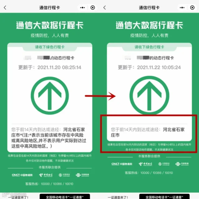 手机用户通过扫二维码、网页或发送短信等方式,获取本人14天内停留4小时以上的地市,根据到访地的疫情状况,生成绿色或红色的通行卡。当天,境外到访地查询功能也上线。