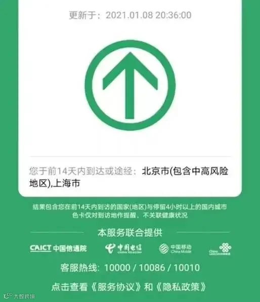 在2021年1月8日晚,行程卡不再对包含中高风险区域的地市名称标记为红色,