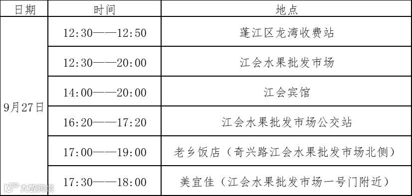 9月27日12:30至20:00到过江门市江会水果批发市场(江门市新会区冈州大道东8—12号)及以下地点的人员,请尽快向所在镇(街)、社区(村)和工作单位主动报备,并就近开展核酸检测。