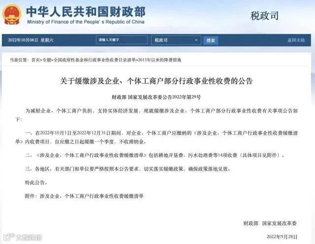 据财政部网站消息,财政部、发改委发布《关于缓缴涉及企业、个体工商户部分行政事业性收费的公告》。其中提到,在2022年10月1日至2022年12月31日期间,对企业、个体工商户应缴纳的《涉及企业、个体工商户行政事业性收费缓缴清单》内收费项目,自应缴之日起缓缴一个季度,不收滞纳金。