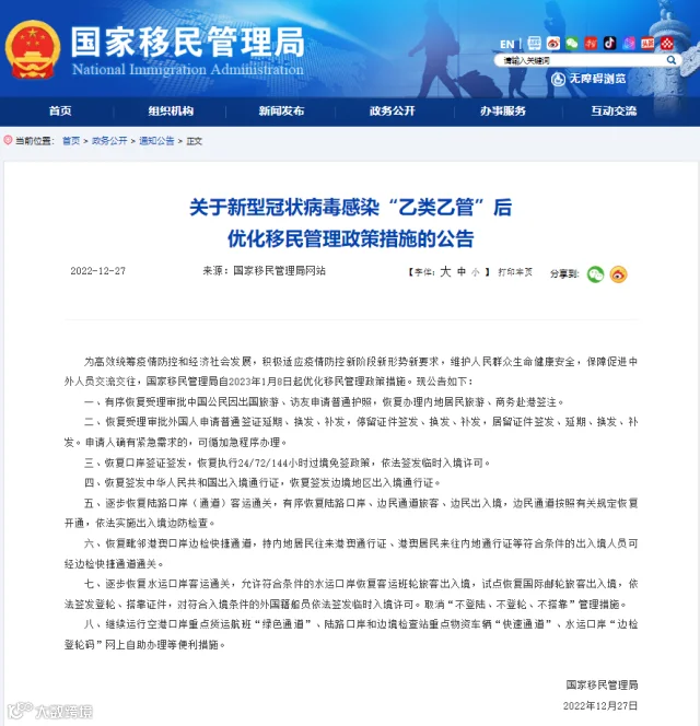 国家移民管理局网站12月27日发布公告,为高效统筹疫情防控和经济社会发展,积极适应疫情防控新阶段新形势新要求,维护人民群众生命健康安全,保障促进中外人员交流交往,国家移民管理局自2023年1月8日起优化移民管理政策措施。现公告如下:
