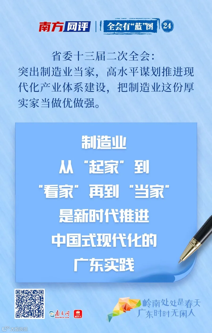 制造业是立国之本、强国之基,是实体经济的基础和国民经济的命脉。20多年来,广东连续占据全国制造业第一大省宝座。推动中国制造实现高质量发展,广东责无旁贷。近日,广东省委十三届二次全会、十三届财经委会议先后召开,提出要聚焦高质量发展这个首要任务,深入推动各项经济工作。特别是要突出制造业当家,高水平谋划推进现代化产业体系建设。从“起家”到“看家”再到“当家”,这是广东省委贯彻落实习近平总书记关于制造业重要论述精神的具体体现,是新时代新征程推进中国式现代化的广东实践。
