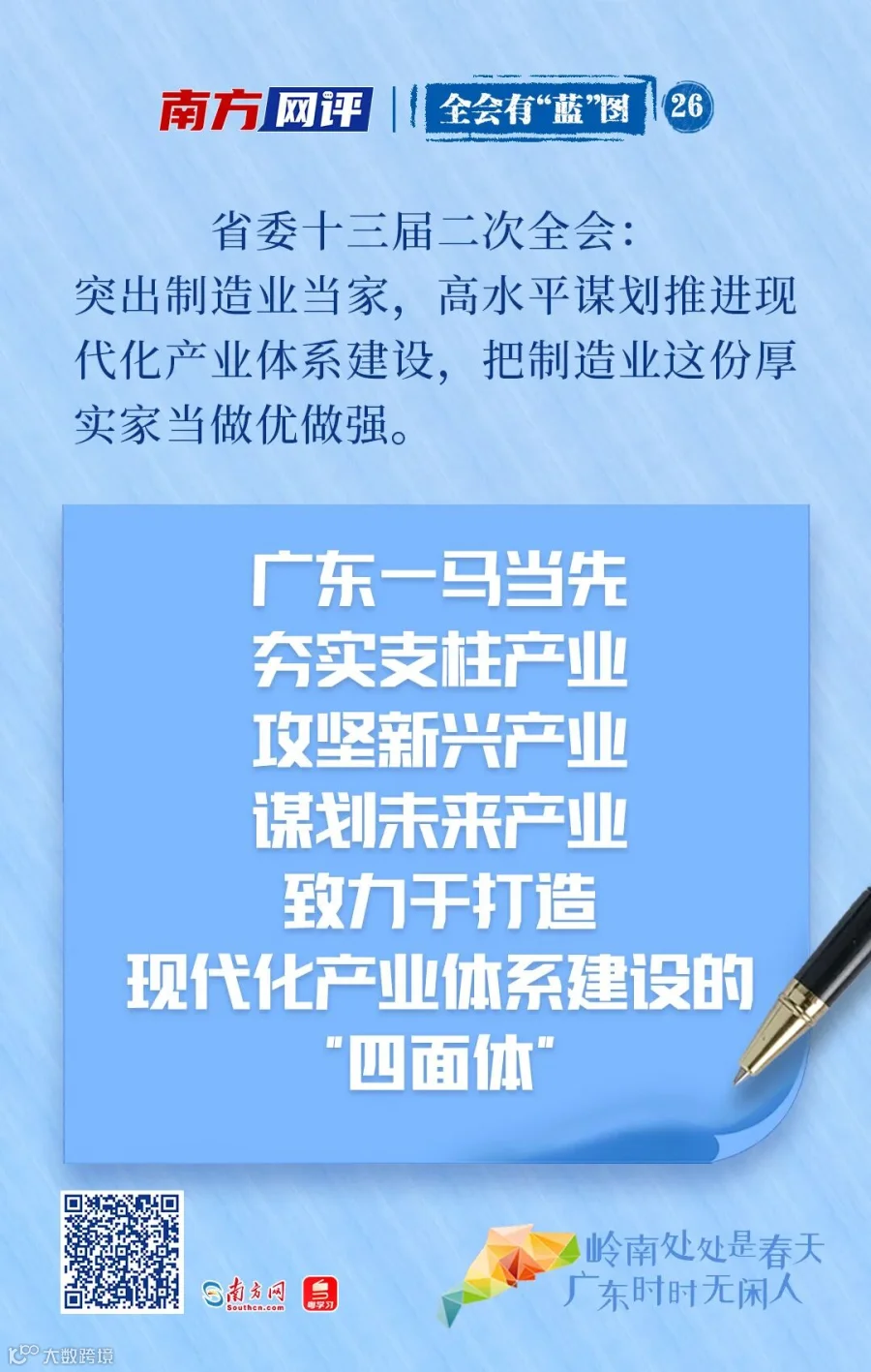 方向已明,路径清晰,目标在望。广东一马当先,拿出硬招实招,夯实支柱产业,攻坚新兴产业,谋划未来产业,致力于打造现代化产业体系建设的“四面体”:世界一流的先进制造业基地,努力培育形成一批产业链条完善、辐射带动力强、具有全球竞争力的战略性产业集群;世界一流的制造业创新聚集地,加快关键核心技术攻关,不断提升自主创新水平与核心竞争力;世界一流制造业高水平开放合作先行地,推进“双区”建设和两个合作区建设,在“一带一路”倡议中先行先试,推动形成更大范围、更深层次、更宽领域的对外开放;世界一流的制造业发展环境高地,持续推进政务服务标准化、规范化、便利化,持续优化市场化、法治化、国际化营商环境。