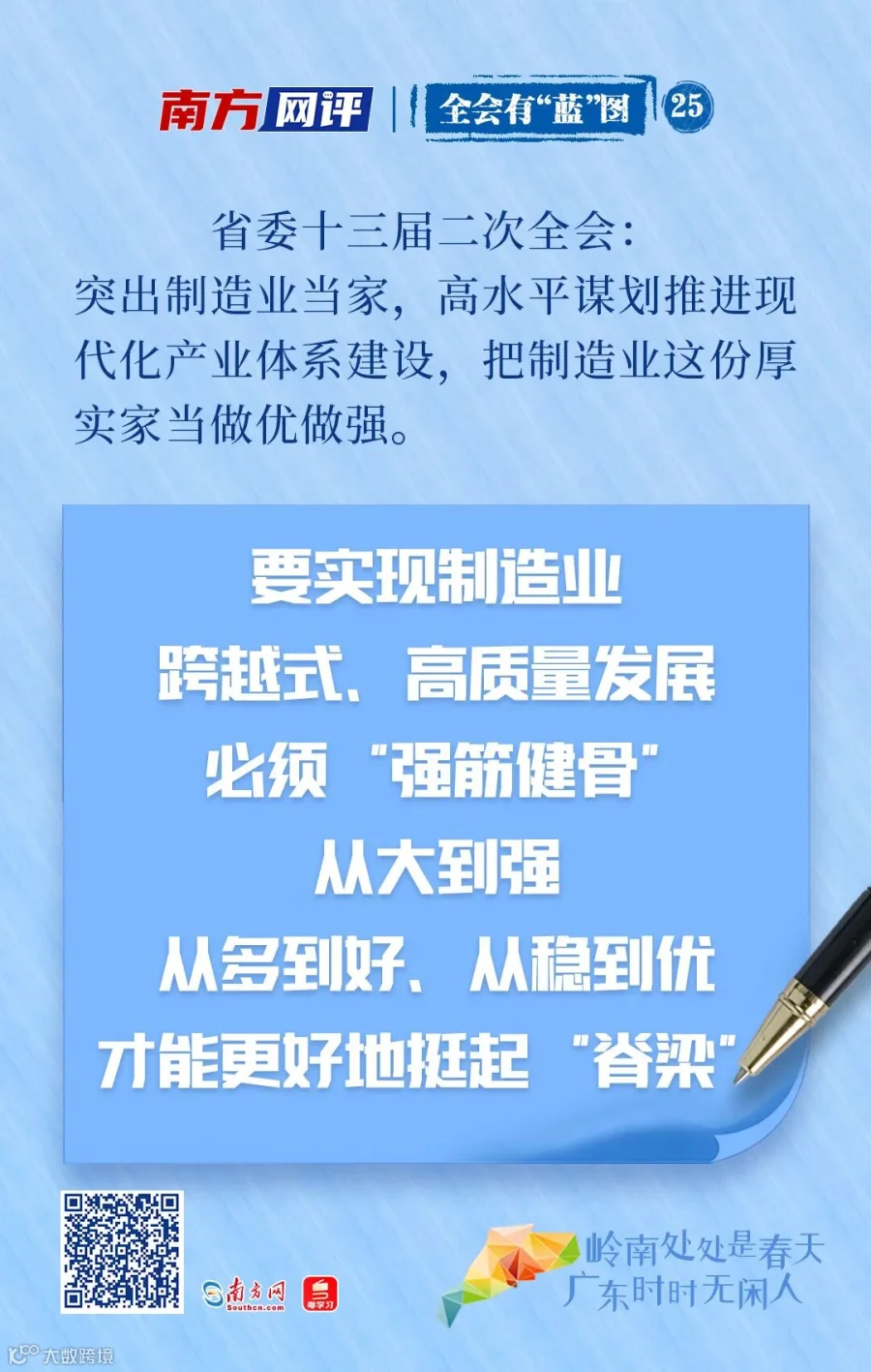 基础不牢,地动山摇。多年来,广东不断稳定制造业规模,从“三来一补”到“世界工厂”;从稳固服装、家电制造等传统产业到发力高端装备制造、新材料、新能源等新兴产业;从依靠“舶来品”到自主创新技术不断打破国外垄断,制造业不断稳固全省经济社会发展中的基础和支柱地位,经济“压舱石”作用日益突出。但要制造业“当好家”“做厚实”,广东依然存在着不少制约高质量发展的痛点难点。要实现制造业跨越式、高质量发展,必须“强筋健骨”,从大到强、从多到好、从稳到优,才能更好地挺起“脊梁”。