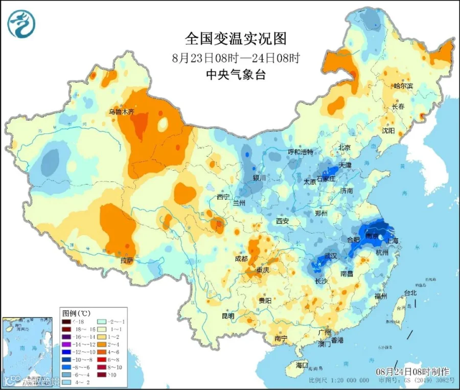 不过,从过去两天的变温实况图来看,冷空气已经从东路南下,越过长江。虽然过江之后冷空气有所减弱,但足以缓解甚至终结长江中下游地区沿江及江北地区的高温。
