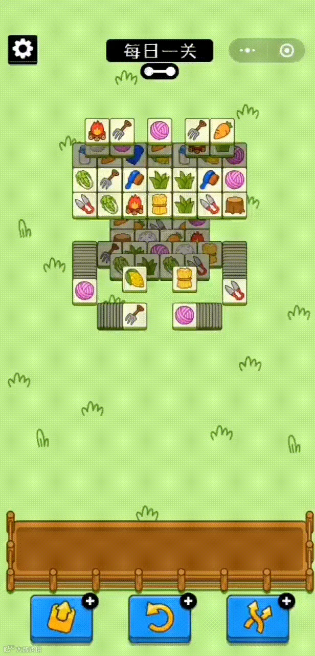 玩法:游戏以麻将消除为玩法原型。下方共有7个空位,从上方拿3个同样图案的方块后即可消除,拿完所有方块即胜利通关,而7个空位被填满则失败。