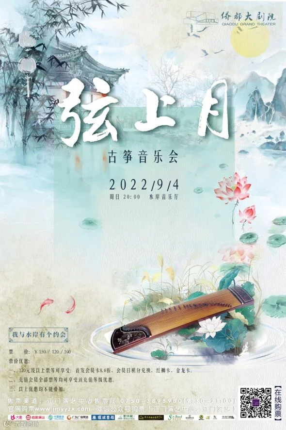 《弦上月》古筝音乐会以“月”为主题,从“月上初弦”“月影婆娑”“月满江畔”三个部分呈现,选择一些经典古曲,通过新的创作编配赋予其新的演奏风貌。专为古筝重奏所创作的新作品等多维度表现月亮的美,籍音乐会祝愿观众人月两团圆。此次音乐会的演奏团体为绿蓑衣乐团,由广东筝友乐团及绿蓑衣室内民乐团组成。其具有专业水准及近二十年演出策划经验,相信能够带给观众一段洗涤心灵的旅程。