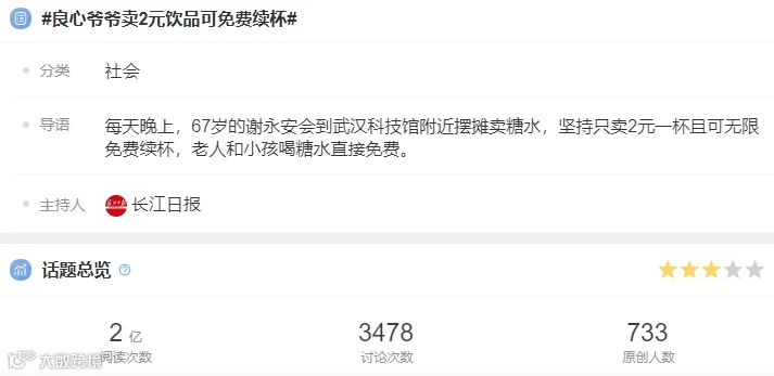经媒体报道,7月28日,话题#良心爷爷卖2元饮品可免费续杯#登上微博热搜,话题阅读次数高达2亿。