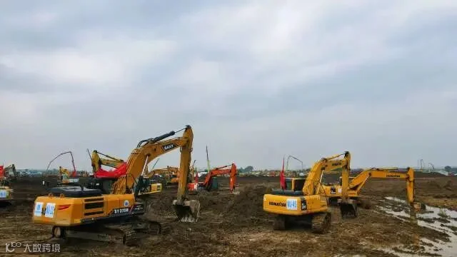 11月16日午间,南沙上空艳阳高照。在广州市南沙区万顷沙镇健康驿站的施工地点,数十辆挖掘机在场地内进行地面平整作业。在施工场地的入口的道路上,前往运送建材的卡车和各种工程车辆排成长龙,等待进场。
