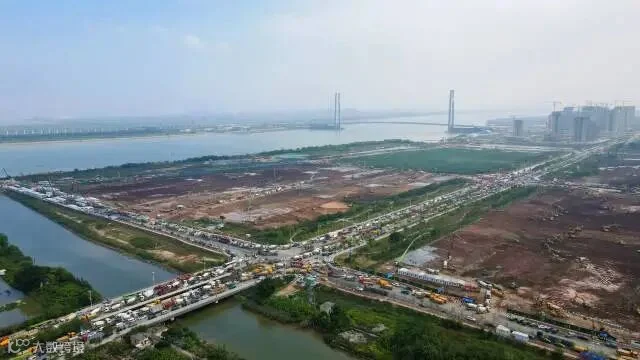 目前,为了保证建设高效推进,园区周边有多名交警、工作人员进行交通指引,整个施工现场秩序良好。