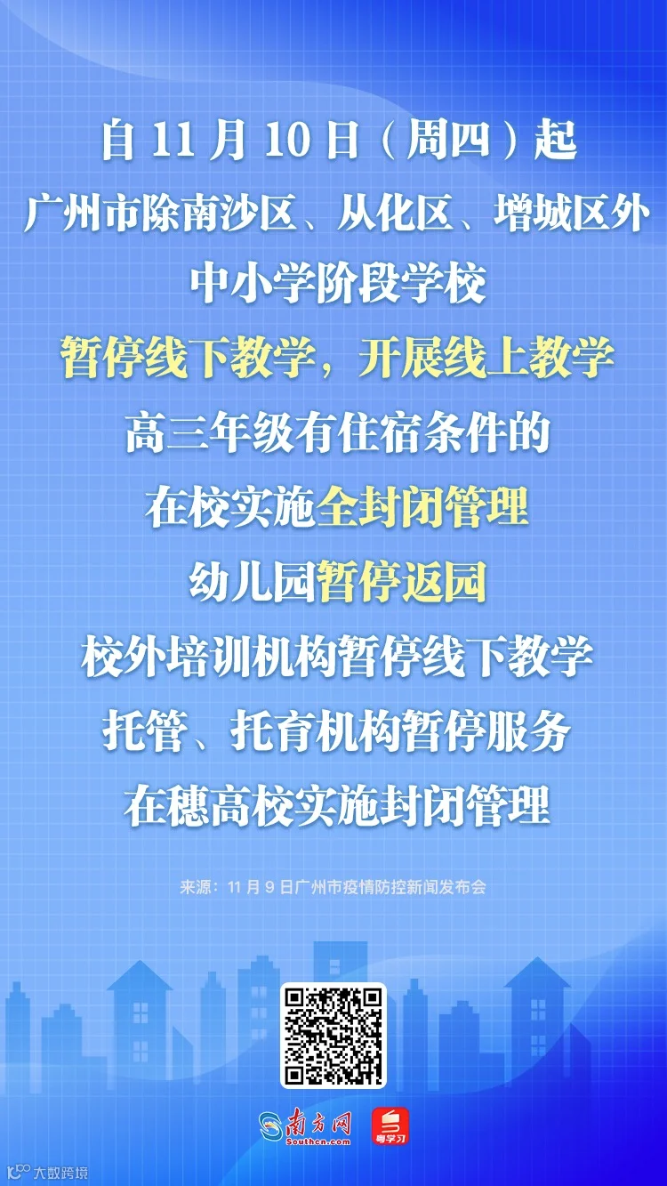 为了稳住全市疫情防控基本盘,集中精力和资源打好海珠攻坚战,全面截断各区之间的传播链条,继海珠实施强化社会面管控措施后,今日起荔湾、番禺在全区范围内也采取了强化社会面管控措施。另外,广州市其他部分区也将根据疫情防控需要,采取中小学暂停线下教学、幼儿园暂停返园等必要防控措施。