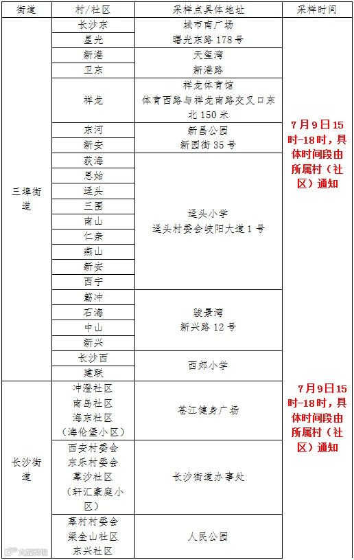 四、区域核酸检测:7月9日、10日及11日连续3天开展全镇区域核酸检测,全镇设44个固定核酸采样点(详见附表)。请广大群众积极配合做好核酸检测,遵守采样点的现场秩序,保持一米距离,做好个人防护,有序到指定地点开展核酸检测。核酸检测前如有接种新冠疫苗的(包括第一针、第二针、第三针),必须相隔48小时后再进行检测。