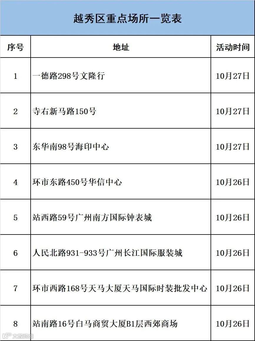 因新冠疫情防控需要,请在相关时段到过越秀区下述重点场所的人员,立即向所在社区联系报备,严格落实“3天3检”,并配合做好疫情防控各项措施。若不如实申报,不落实防控措施,造成严重后果的,将承担相应法律责任。