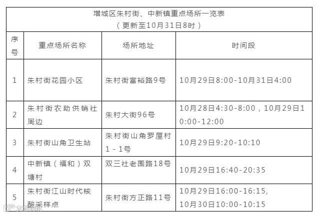 10月30日,增城区在重点人员核酸筛查中发现1名核酸检测异常人员。因疫情防控需要,请有以下时空交集的市民,立即向所在社区(村)报备,自觉开展“三天三检”自我健康监测,在24小时内主动到就近核酸检测点检测,并做好健康管理,落实个人防护措施。重点场所名单见下表,后续将按实际情况更新。