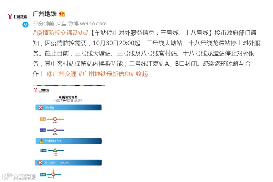 “广州地铁”微博发布消息,接市政府部门通知,因疫情防控需要,10月30日20:00起,三号线大塘站、十八号线龙潭站停止对外服务。