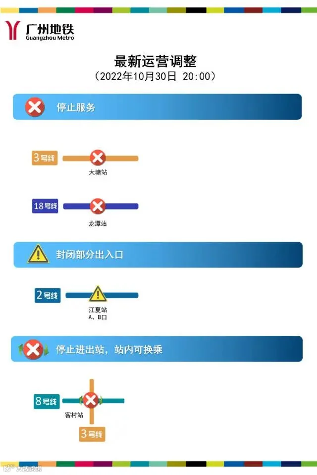 截至目前,三号线大塘站、三号线及八号线客村站、十八号线龙潭站停止对外服务,其中客村站保留站内换乘功能;二号线江夏站A、B口封闭。